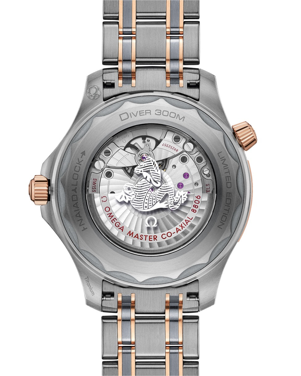 Introducing the Omega Seamaster Diver 300M Co-Axial Master Chronometer, a stunning 42mm timepiece crafted from titanium, tantalum, and Sedna™ gold. This luxurious watch features a unique Grey dial with sun-brushed waves, complemented by 18K Sedna™ gold hands and indexes filled with white Super-LumiNova for excellent legibility. The unidirectional rotating bezel combines Sedna™ gold and tantalum, while the transparent caseback showcases the Master Chronometer Calibre 8806, certified for its precision and magnetic resistance. The watch is water-resistant up to 300 meters, equipped with a helium escape valve, and comes on a titanium bracelet with tantalum and Sedna™ gold links. Offered in unworn condition, this exceptional piece blends cutting-edge technology with exquisite design, perfect for collectors and diving enthusiasts alike. Secure this masterpiece today and experience the pinnacle of Swiss watchmaking excellence.