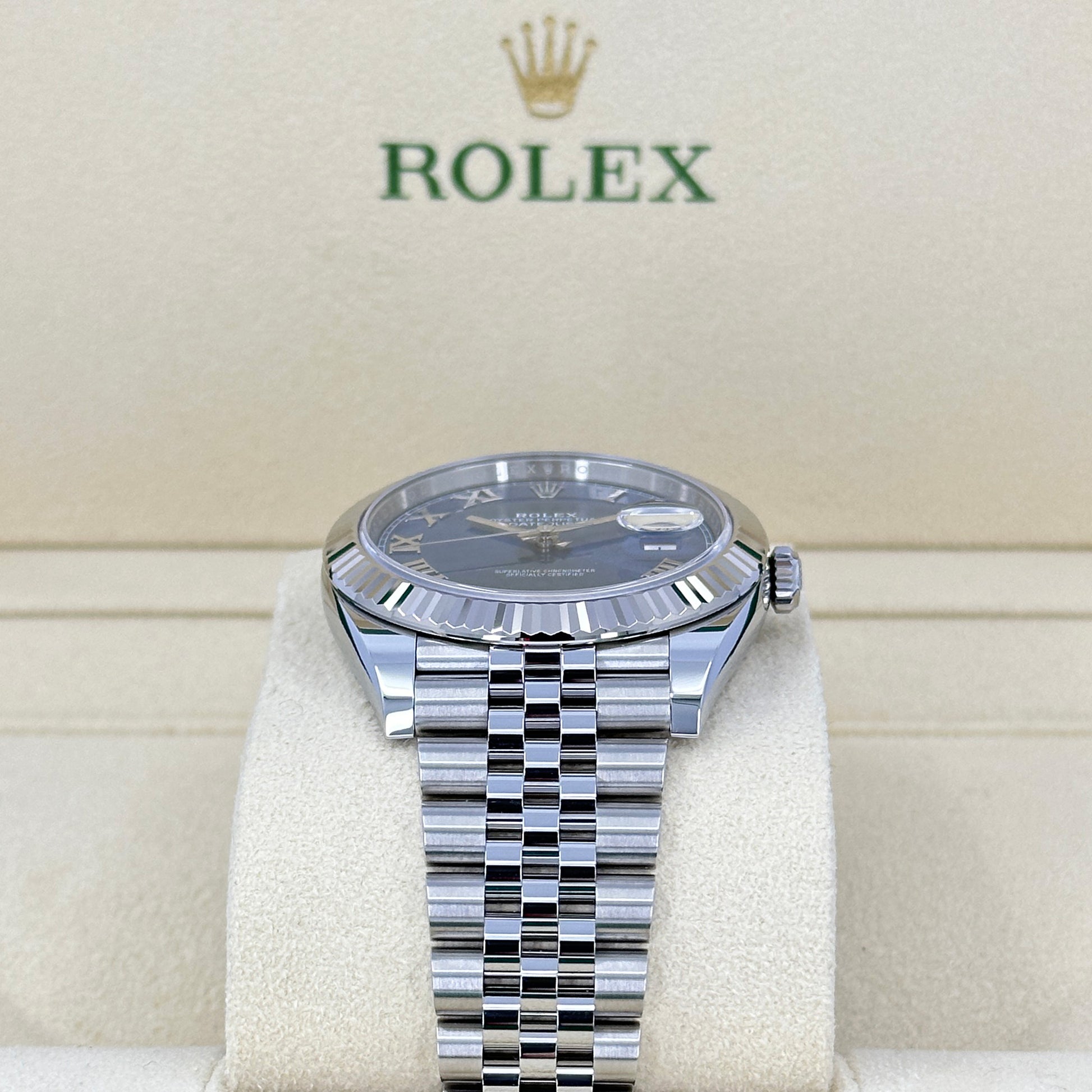 Rolex Datejust 41 watch with polished Stainless Steel and 18k White Gold case, Reference 126334-0026. This model has Azzurro blue dial with a fine sunray. The dial is adorned polished hands - hour and minute hands with partial luminous fill. Applied polished Roman numerals hour markers. Fine printed minute track on teh dial. Date window with a "Cyclops" magnifying lens displayed at the 3 o'clock position. Polished Stainless Steel "Twinlock" crown, featuring two sealed zones when the crown is screwed down: the first inside the tube of the crown, the second inside the winding crown itself. The dial closed by a Scratch-resistant Sapphire Crystal and solid case back made. The watch is equipped Fluted fixed polished 18k White Gold bezel. The watch is mechanical self-winding Manufacture Rolex 3235 contains 31 Jewels and has an approximate power reserve of 70 hours of power reserve. This model presented on Jubilee Stainless Steel bracelet of brushed outer links and polished center links with a Folding Oysterlock safety clasp with Easylink 5 mm comfort extension link. The water resistance is up to 100m/330ft (10 ATM).