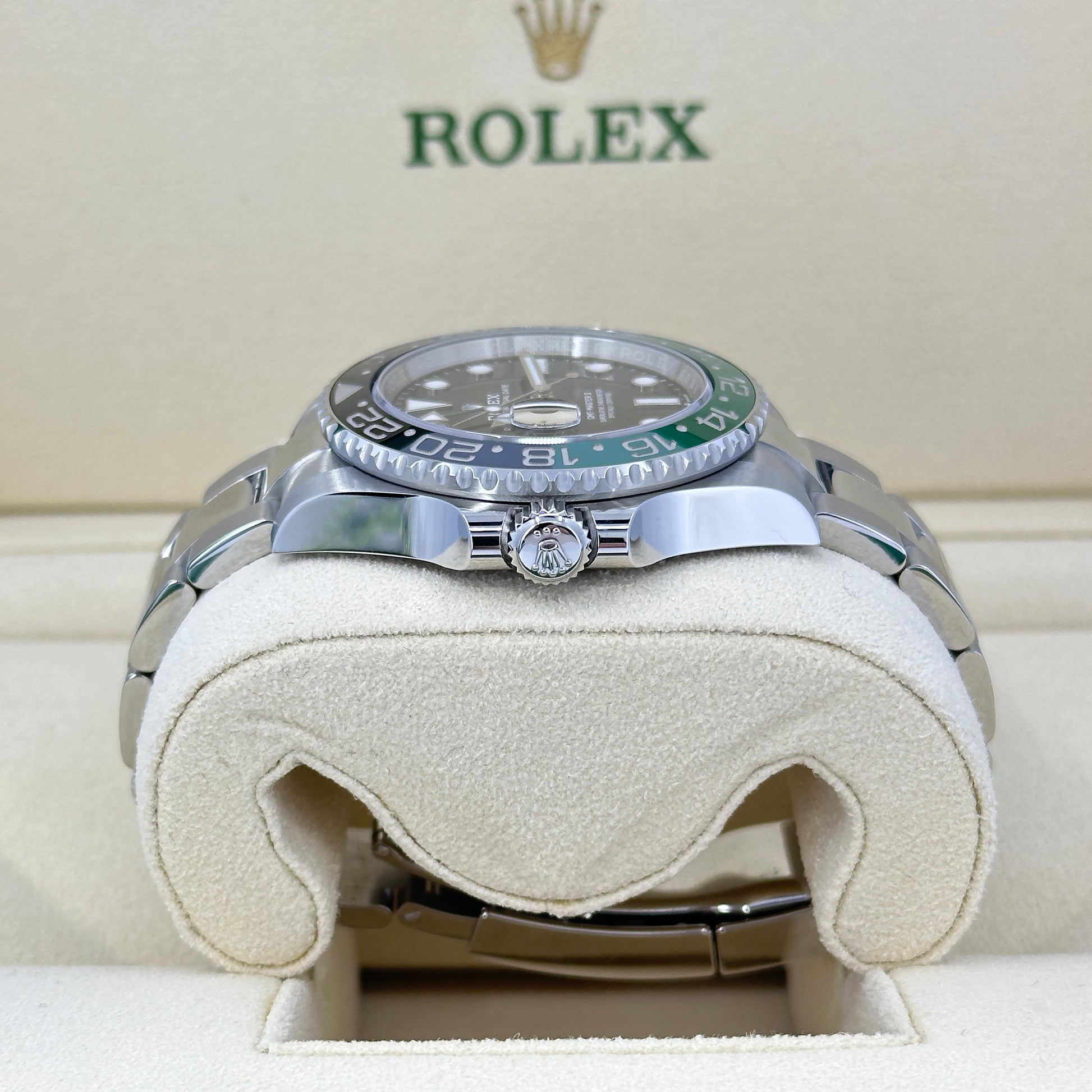 Crafted expertly with Oystersteel, the Rolex GMT-Master II Sprite has a 40mm case that houses a black lacquer dial featuring 18K white gold hands. The two-colour green and black Cerachrom insert bezel is bidirectional and graduated in 24-hours, with moulded numerals for easy recognition. Its Scratch-resistant sapphire crystal and Chromalight hands provide a striking blue luminescence. The Oyster bracelet has a folding Oysterclasp for secure and comfortable wear.