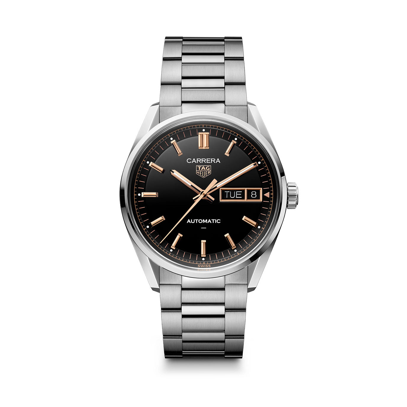TAG Heuer Carrera Day-Date (ref. WDA2111.BA0043) refines the Carrera’s sporty elegance with a deep black opalin dial, creating a sharp backdrop for the warm 18K 5N rose-gold-plated hands and applied indexes. The day and date at 3 o’clock bring true everyday usability, while the clean flange and crisp minute track keep the design modern and uncluttered. A 41 mm steel case with fine-brushed and polished facets wears comfortably and looks equally at home with a suit or casual weekend clothing. Turn it over and the sapphire exhibition back reveals the movement and a Victory Wreath engraving—an emblem of the Carrera’s racing heritage. Inside beats the automatic TH31-02, engineered for dependable precision at 4 Hz and a class-leading 80-hour power reserve, so it will keep running after a couple of days off the wrist. Condition: unworn, like-new; supplied as a complete set with original box and papers, including warranty. With 100 m water resistance, it’s ready for daily life, and the three-row H-shaped bracelet offers easy sizing via removable links and a secure double-safety folding clasp.